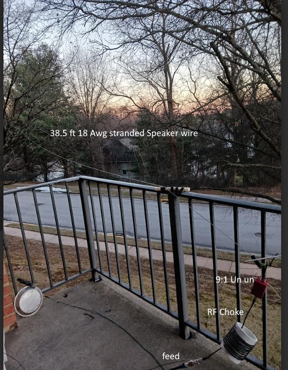 In a limited Space- Apartment or Condo with a Balcony, can an end-fed antenna work well enough for 10-40 Meters? First is the ARRL Exposure Calculation. Cost Speaker wire, Un Un Spare RG 58. EFHW below in the photo.