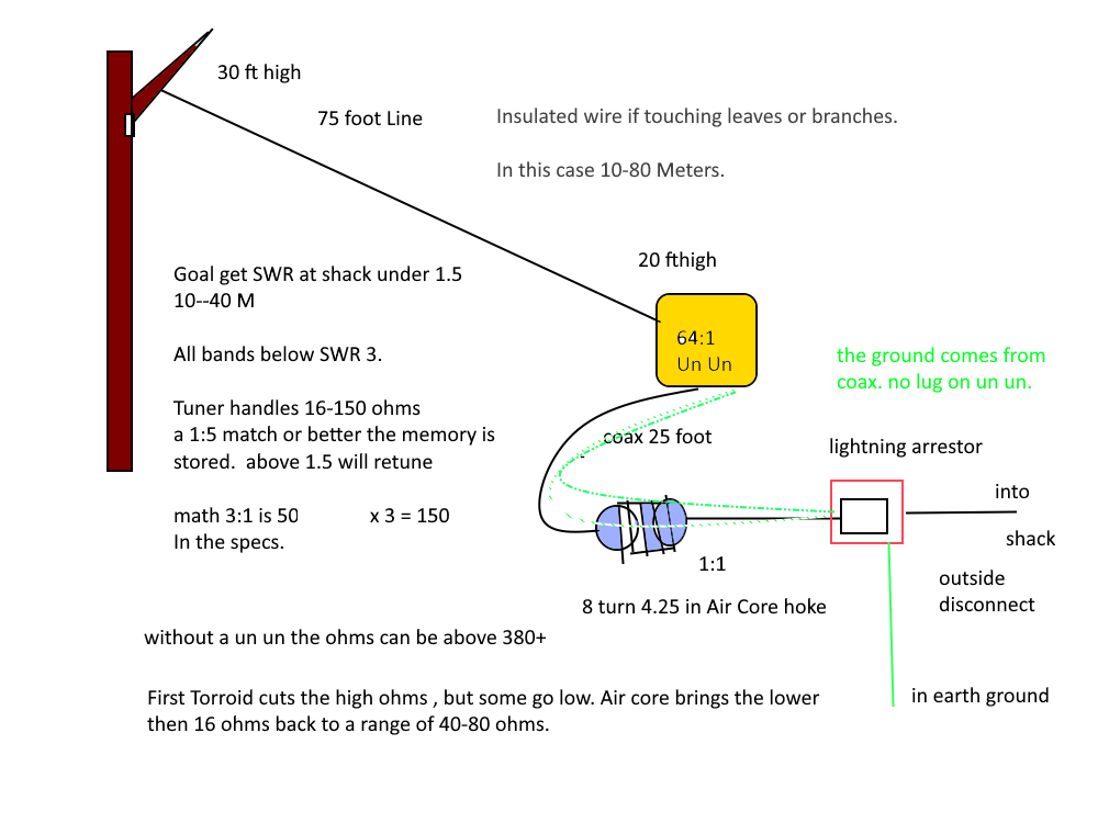Simple design. Length is critical. 40 feet plus in length. Goal is 10-40 Bands. 60 and 80 can be achieved. Great for limited space. Dipoles are double the length. Under $100.00