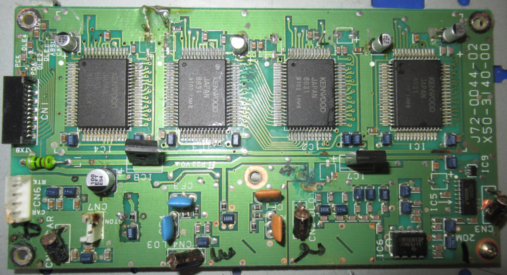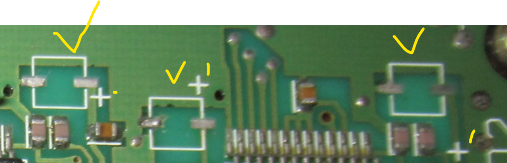 Above – leaky cap took out 3 traces. Not the best looking, but the continuity checks out. Replacing with Panasonic 470 μF 25V. The original was 16v. 2 others to replace 100uf 25 v.
